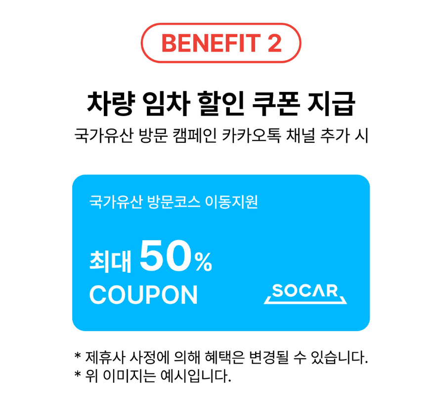 - 차량 임차 할인쿠폰: '쏘카'와 협업하여 차량 임차 할인쿠폰 제공 (카카오톡 채널 추가 시)