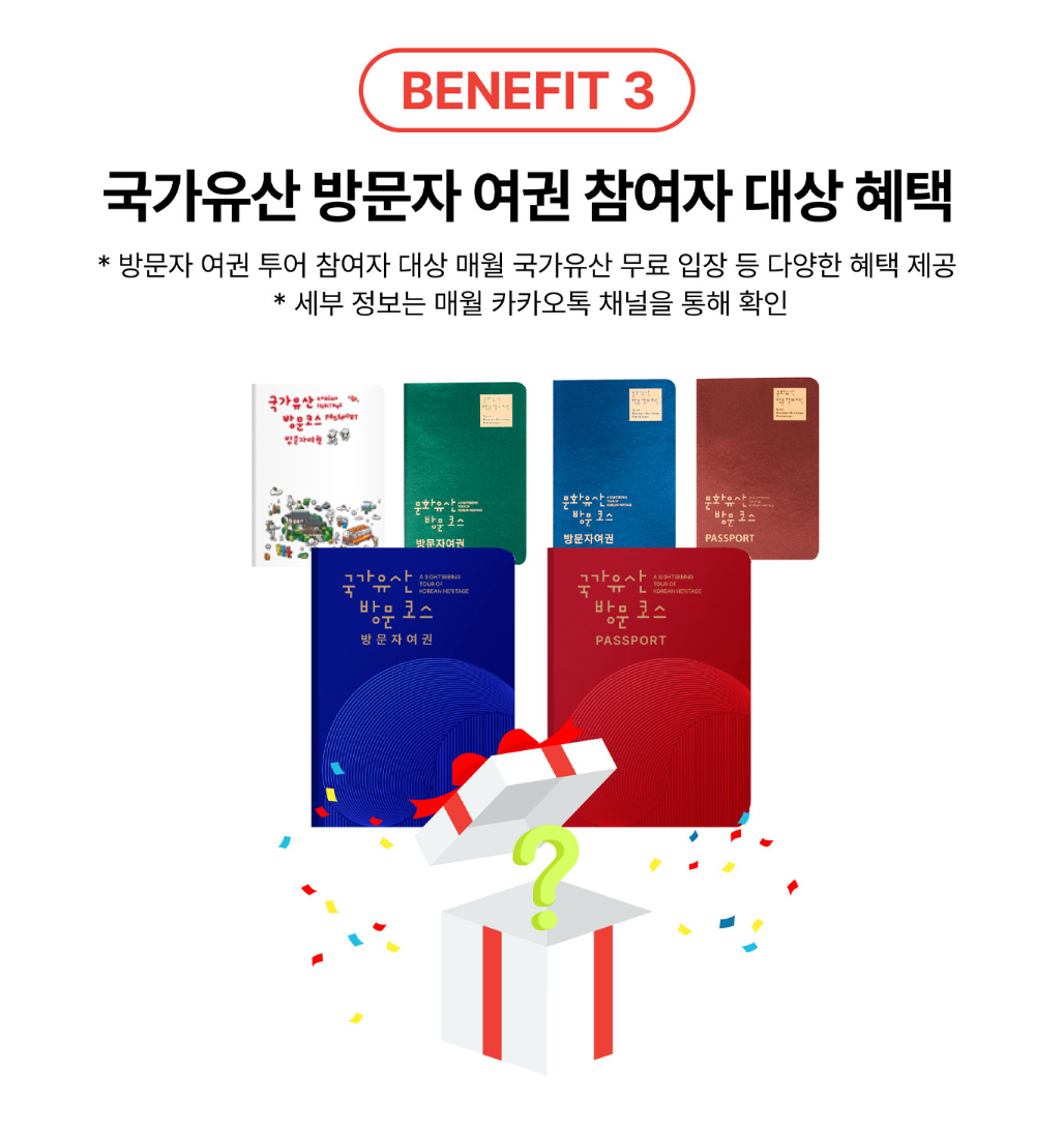 - 내용: 매월 지정된 국가유산 방문코스를 중심으로 지역 및 민간기업과 협업하여 교통, 숙박, 입장권 할인쿠폰 등 다양한 혜택 제공