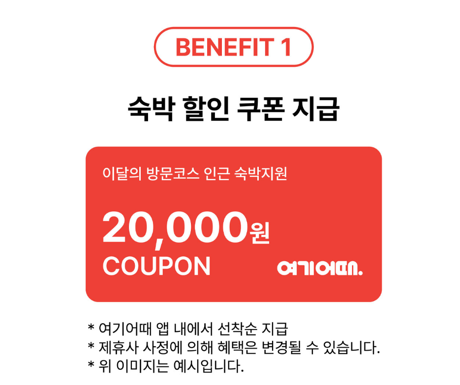 - 숙박 할인쿠폰: '여기어때' 앱을 통해 선착순으로 숙박 할인쿠폰 제공