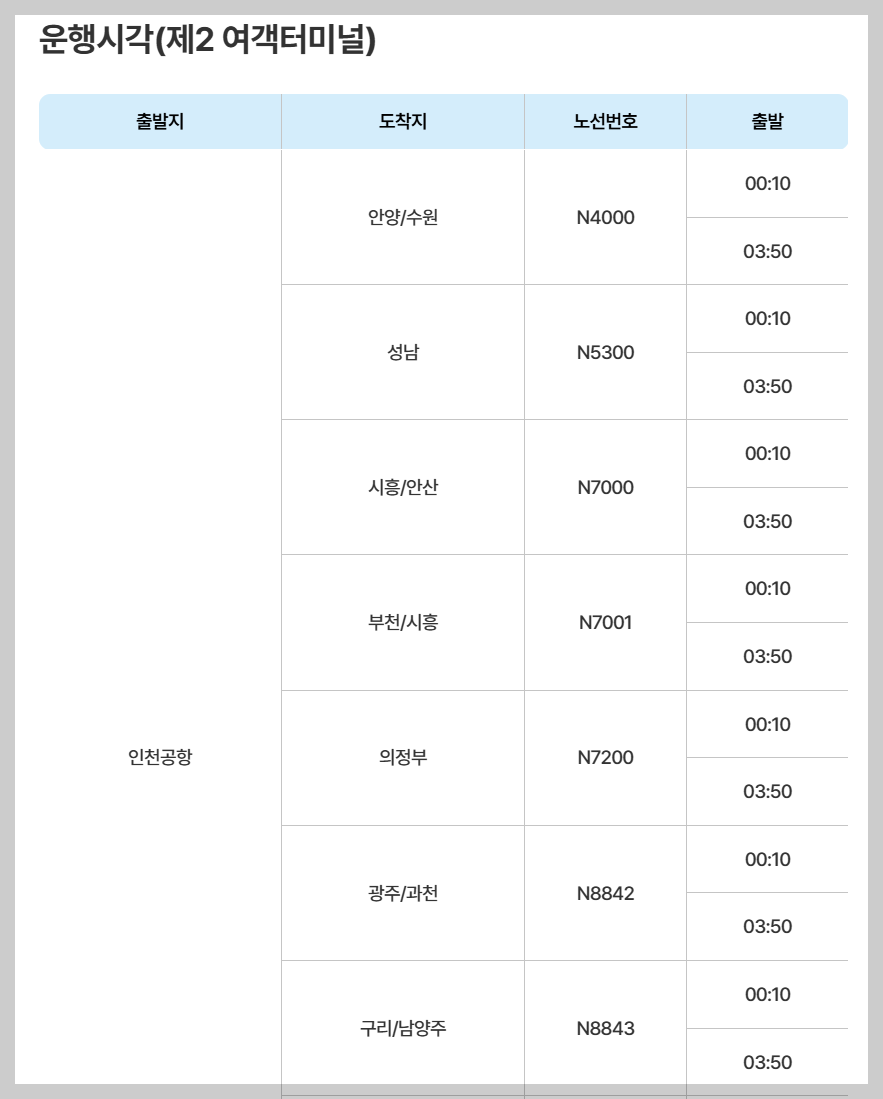하지만 걱정하지 마세요. 인천공항에는 늦은 시간에도 운행하는 심야버스가 있습니다!